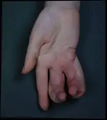 Female hand showing deformity due to x-ray burns. The inflammation is due to excessive radiation, which occurs when x-ray machines are unshielded.