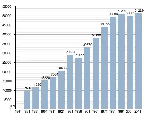 في سنة 1871 بلغ عدد السكان 9٬718 نسمة، وتطور العدد ليصل في سنة 2011 لـ 51٬229 نسمة.
