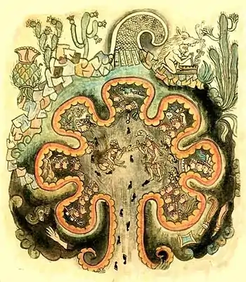 تشير أساطير الناهيواتل إلى أن سبع قبائل، بما في ذلك المكسيكية، عاشت في تشيكوموزتوك ("مكان الكهوف السبعة"). وقد غادرت هذه القبائل بعد ذلك الكهوف واستقرت في مكان ما في المنطقة التي تضم حاليًا شمال المكسيك أو جنوب غرب الولايات المتحدة الأمريكية.[6]