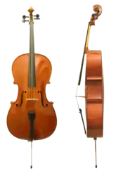 ![]() التشيلو ، منظر أمامي وجانبي. يتم سحب الدبوس الطرفي الموجود في الأسفل أو إزالته لتسهيل التخزين والنقل ، وضبط ارتفاعه وفقًا للعازف. |