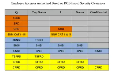 تصريح الوصول Q ذو فئة A يساوي بيان السرية الأعلى لوزارة الدفاع الأمريكية "للوصول إلى معلومات سرية معينة مثل المعلومات الحساسة المقاسة أو برامج الوصول الخاصة ويجوز لمالك المعلومات فرض متطلبات إضافية أو شروط خاصة حتى إذا كان الشخص مؤهلاً للحصول على تصريح أمني أو تصريح دخول على أساس المعاملة بالمثل".[4]