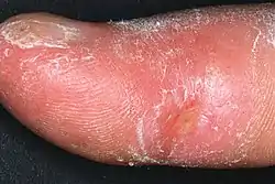 ![]() مظهر سريري يُظهر نخر في الإبهام لمريض مصاب بتصلب الجلد المنتشر. مظهر سريري يُظهر نخر في الإبهام لمريض مصاب بتصلب الجلد المنتشر. | |