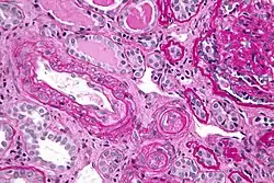 المرضى الذين لديهم تأثر سريعة في الجلد يكونون أكثر عرضة لمضاعفات الكلى،[25] وهو الأكثر شيوعًا في تصلب الجلد الجلدي المنتشر، وغالبًا ما يرتبط بالأجسام المضادة ضد بوليميريز الحمض النووي الريبوزي (في 59٪ من الحالات). يشرع الكثيرون في غسيل الكلى، رغم أنه يمكن إيقاف ذلك في غضون ثلاث سنوات في حوالي ثلث الحالات. ارتفاع السن وانخفاض ضغط الدم في العرض التقديمي يجعل الحاجة لغسيل الكلى ملحة.[26]