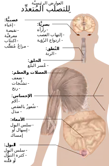 التصلب المتعدد[2] ويعرف بأسماء عديدة، منها التصلّب اللويحي [3] والتصلب المنتثر أو التهاب الدماغ والنخاع المنتثر (بالإنجليزية: Multiple sclerosis)، وهو التهاب ينتج عن تلف الغشاء العازل للعصبونات في الدماغ والحبل الشوكي. يُعطّل هذا التلف قدرةَ أجزاءٍ من الجهاز العصبي على التواصل، مما يؤدّي إلى ظهور عددٍ من الأعراض والعلامات المرضية،[4][5] منها أعراض عضوية أو إدراكية عقلية،[5] وأحياناً تكون على شكل مشاكل نفسية.[6] يتّخذُ التصلّب المتعدّد عدّة أشكال مختلفة مع أعراض جديدة تحدث إما على شكلِ نوباتٍ منفصلة (أشكال ناكسة) أو متراكمة بمرور الوقت (أشكال مترقّية).[7] وقد تختفي الأعراض بين النوبات بالكامل، لكن المشاكل العصبية الدائمة تحدث في أغلب الأحيان خصوصاً إذا كان المرض في مراحل متقدمة.[7]