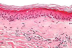 ![]() صورة مجهرية لتصلب تحت الظهارة (في الثلث الأوسط) لحالة مصابة بالحزاز المتصلب. صورة مجهرية لتصلب تحت الظهارة (في الثلث الأوسط) لحالة مصابة بالحزاز المتصلب. | |
