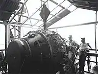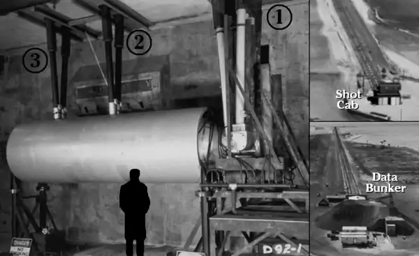 الانابيب تطلق إلى السقف. التي يبدو أنها تدعم، هي أنابيب ضوء التشخيصية. الانابيب الثمانية في النهايات اليمنى (1) أرسلت معلومات حول التفجير الابتدائي. اثنين في الوسط (2) لوحظ الوقت عندما وصل الإشعاع في النهاية البعيدة لقناة الإشعاع، والفرق بينهم (2) و (3) يكون وقت عبور الإشعاع للقناة.[31]
