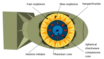 - الانبجار: كتلة المادة الانشطاريه لإحدى (U-235 - Pu-239 أو الاثنان سوية) و تكون محاطة بمواد شديدة الانفجار التي تقوم بالضغط على الكتلة وتسبب التدمير.