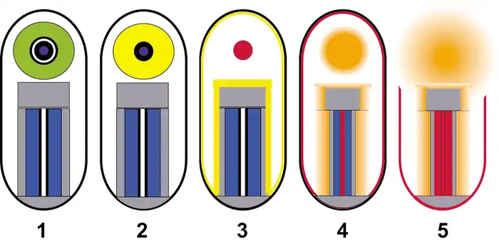 - رأس حربي قبل التفجير الكرويات المتداخلة في الأعلى هي الإندماجات الرئيسية أما الأسطوانات السفلية فهي أجهزة التبغثر الثانوية