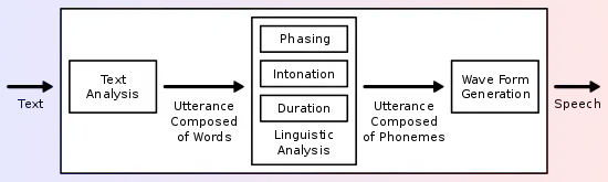 ويتألف نظام تحويل النص إلى كلام (أو "المحرك") من جزئين :[3] و معالج الواجهة الأمامية الأمامي و معالج الواجهة الخلفي. الواجهة الأمامية واثنتين من المهام الرئيسية. أولا: أنه يحول النص الخام الذي يحتوي على رموز مثل الأرقام والمختصرات إلى مايعادل كلمات مكتوبة بها. وغالبا ما تسمى هذه العملية تطبيع النص، ما قبل المعالجة، أو ترميز' ' الواجهة الأمامية ثم يعين نسخ لفظي في علوم الكمبيوتر، التحليل المعجمي هو عملية تحويل سلسلة من الأحرف (كما هو الحال في برنامج كمبيوتر أو صفحة ويب) إلى سلسلة من الرموز (سلاسل مع "معنى" محدد) بالنسبة لكل كلمة، والأجزاء، وتحديد النص في وحدة لحنية، مثل شبه جملة شرط ، والجملة. ويطلق على عملية تعيين التدوين الصوتي لعبارة أي تحويل النص إلى صوت أو حرف من حروف اللغة -إلى صوت تحويل. التدوين الصوتي ومعلومات علم العروض التي يشكلون معا التمثيل اللغوي الرمزي الذي يتم إخراجه من قبل الواجهة الأمامية. والواجهة الخلفية، غالبا ما يشار إليها باسم المزج أو التوليف - ثم تقوم بتحويل التمثيل اللغوي الرمزي إلى صوت. في بعض الأنظمة، فإن هذا الجزء يشمل حسابات تستهدف علم العروض "" (درجة الصوت فترات الصوت),[4] وهو بعد ذلك يحدد الخطاب المفترض على الإنتاج الصوتي.