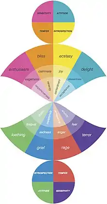 يقدم روبرت بلوتشيك نموذجًا ثلاثي الأبعاد عبارة عن مزيج من الفئات الأساسية المعقدة ونظريات الأبعاد. إنه يرتب المشاعر في دوائر متحدة المركز حيث تكون الدوائر الداخلية أكثر أساسية والدوائر الخارجية أكثر تعقيدًا. والجدير بالذكر أن الدوائر الخارجية تتشكل أيضًا من خلال مزج مشاعر الدائرة الداخلية. ينبع نموذج بلوتشيك، مثل نموذج راسل، من تمثيل دائري، حيث تم رسم الكلمات العاطفية بناءً على التشابه. [11] هناك العديد من المشاعر التي تظهر بعدة درجات ويمكن دمجها بطرق مختلفة لتشكيل "ثنائية" عاطفية. [12] [13] [14] [15] [16]