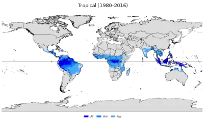 تتميز المناخات المدارية بدرجات حرارة عالية ثابتة (عند مستوى سطح البحر والارتفاعات المنخفضة) ؛ يبلغ متوسط درجات الحرارة في كل 12 شهرًا من العام 18 درجة مئوية (64.4 درجة فهرنهايت) أو أعلى ؛ وهطول الأمطار السنوي مرتفع بشكل عام. وهي مقسمة على النحو التالي: