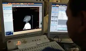 ![]() ماسح صور مقطعية يتألف من جملة تصوير مقطعي بإصدار البوزتروناتPET مترافقة مع تصوير مقطعي محوري بالأشعة السينية CT (تعطي 16 صورة مقطعية بالتصوير المقطعي المحوري بالأشعة السينية 16-slice CT)، أما الأداة المعلقة بالسقف من جهة اليسار فتمثل مضخة لحقن عامل التباين في التصوير المقطعي المحوري | |