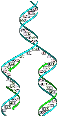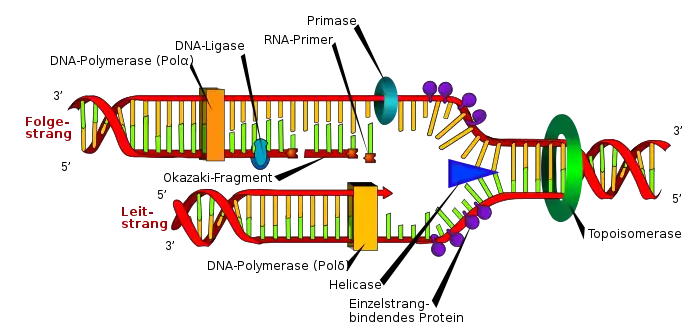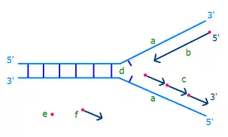 دنا بوليميراز هو الانزيم الرئيسي المسؤول عن تصنيع سلاسل الدنا الجديدة، يتم بناء السلسلتين الجديدتين باتجاه واحد وهو من 5' إلى 3' وذلك لقدرة دنا بوليميراز على إضافة نوويد جديد على مجموعة الهيدروكسيل (OH) الموجودة على ذرة الكربون رقم 3 فقط.