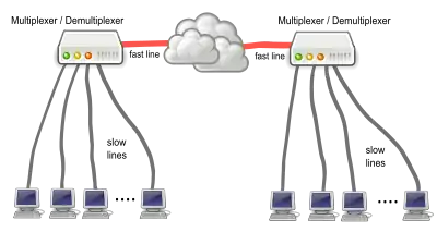 مبدأ عمل التضميم، حيث يتم تضميم الإشارة من الخطوط البطيئة لعدة مرسلين ليتم تحويلها إلى إشارة واحدة يتم نقلها عبر خط نقل سريع. في الجهة المقابلة عند المستقبلين، يتم استقبال الإشارة واستخلاص الإشارات التي تحتويها