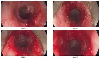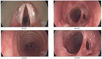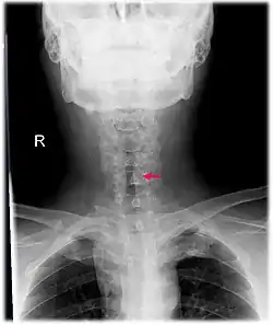 ![]() صورة أمامية بالأشعة السينية على رقبة مريض به تضيق "تحت المزمار" ما بعد التنبيب. يمكن رؤية التضييق الحادث في تجويف القصبة الهوائية والمُشار إليه بالسهم. صورة أمامية بالأشعة السينية على رقبة مريض به تضيق "تحت المزمار" ما بعد التنبيب. يمكن رؤية التضييق الحادث في تجويف القصبة الهوائية والمُشار إليه بالسهم. | |