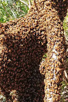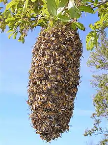 وتنقسم طوائف النحل بسبب ارتفاع عدد أفرادها بحيث لا تستطيع الخلية إستيعاب عددها الكثير كما يصعب على الملكة القديمة وضع البيض لقلة العيون السداسية الفارغة فتغادر الملكة القديمة الخلية مع بضعة آلاف من الشغالات وعدد قليل من الذكور لتبحث عن مسكن جديد، يحدث التطريد عادة في منتصف النهار الدافئ حيث تطير هذه المجموعة بصورة مفاجئة من الخلية إلى الهواء لعدة دقائق ثم تحط الملكة ومجموعتها على غصن شجرة أو تقف على سطح مناسب وتجتمع حولها الشغالات في شكل عنقود متراص وتطير حول هذا العنقود مجموعة قليلة من النحل الكشاف حيث تقوم بعملية البحث عن مكان جديد وثابت.[1]