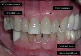 يشار إلى انكشاف جذور الأسنان بسبب فقدان الأنسجة الكيراتينية حول أعناق الأسنان باسم انحسار اللثة. يمكن أن يؤدي ذلك إلى حساسية أو ألم في سطوح جذور الأسنان المكشوفة (العاج أكثر نفوذية ولينة مقارنة بالمينا، وعاج الأسنان هو المشكل لجذور الأسنان). قد يتسبب الانحسار أيضًا بمظهر غير جمالي خاصة إذا كان موجودًا في الأسنان الأمامية (القواطع). لا تتطلب جميع حالات انحسار اللثة تصحيحًا جراحيًا، إذ توجد العديد من الخيارات حسب رغبة المريض. يجب تعزيز فكرة أن عدم معالجة الانحسار لن يؤدي إلى فقدان الأسنان -على عكس الاعتقاد الشائع- إذ يمكن الحفاظ على الانحسار المتروك دون علاج باستخدام تقنيات التنظيف بالفرشاة وإجراءات الصحة الفموية (كينيدي ودورفمان وآخرون). من ناحية أخرى، إذا رغب المريض بمتابعة العلاج التصحيحي، فهناك مجموعة واسعة من التقنيات تتراوح بين الطعم الذاتي (الأنسجة الخاصة بالمريض نفسه، وعادة ما تؤخذ من الحنك)، والطعم المماثل «الخيفي» (نسيج شخص آخر، أو جثة)، والطعم الأجنبي (من حيوان، عادة ما يكون من الخنازير أو الأبقار) أو ببساطة إعادة وضع الأنسجة الأصلية في الموقع. غالبًا ما تؤدي فوائد العلاج التصحيحي إلى انخفاض الحساسية بعد تغطية أسطح الجذور بالإضافة إلى زيادة الأنسجة الكيراتينية المذكورة مسبقًا.