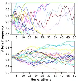 الانحراف الوراثي (بالإنجليزية: genetic drift) هو تغير تواترات الألائل عشوائياً من جيل لآخر بسبب التوزيع العشوائي للألائل. أي أنَّ الألائل تخضغ لخطأ الاستعيان (بالإنجليزية: sampling error)، وهو الخطأ في تمثيل العينة للمجتمع. فالألائل التي يحصل عليها النسل (العينة)، تكون تواتراتها مختلفة عن تواترات ألائل الجيل السلفي (المجتمع).[136] فعندما تكون القوى الانتقائية ضعيفة نسبياً أو معدومة، "ينحرف" تواتر الألائل لأعلى وأسفل على نحو عشوائي (بسير عشوائي). ويتوقف التواتر عن الانحراف حين يثبت الأليل - إما يزول من التجمع أو يستبدل الألائل الأخرى بالكامل. لهذا قد يتسبب الانحراف الوراثي بإزالة ألائل من التجمع نتيجة للصدفة فقط. حتى بغياب القوى الانتقائية، الانحراف الوراثي قد يؤدي لانحراف وتباعد تجمعين منفصلين كانا قد بدآ بنفس المبنى الجيني، إلى أن يصبحا تجمعين مختلفين بمجموعات مختلفة من الألائل.[137]
