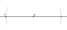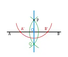 - (الأحمر): ارسم دائرة مركزها النقطة P لتقطع الخط المستقيم AB في A' وB'، فتكونان متساويتا البعد عن P,