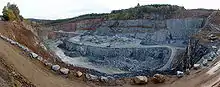 صخرة في منجم كبير مفتوح. لاحظ حجم حفارات المقياس (المقدمة، اليسار) ، وأن الجزء السفلي من المنجم غير مرئي.