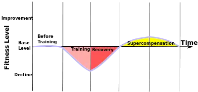 يُمكن تقسيم مستوى لياقة أي جسم بشري أثناء التدريب إلى أربع فترات: اللياقة البدنية الأولية والتدريب والاستعادة والتعويض المثالي. فخلال فترة اللياقة البدنية الأولية، يكون لهدف التدريب مستوى أساسي من اللياقة البدنية (موضح في قطاع الوقت في الرسم البياني). وعند الدخول في فترة التدريب يقل مستوى اللياقة البدنية للهدف (التدريب عملية تفويضية، موضحة في القطاع الثاني للوقت في الرسم البياني). وبعد التدريب يدخل الجسم في فترة الاستعادة والتي يرتفع مستوى اللياقة خلالها إلى مستوى اللياقة البدنية الأولية (موضحة في القطاع الثالث للوقت في الرسم التوضيحي). ولأن جسم الإنسان عبارة عن كائن حي قابل للضبط، فسوف يشعر بالحاجة إلى ضبط نفسه إلى مستوى أعلى من اللياقة تحسبًا لجلسة التدريب التالية. وكذلك لا يتوقف مستوى اللياقة البدنية التي تعقب جلسة التدريب عند مستوى اللياقة البدنية الأولية. بل يدخل الجسم بدلاً من ذلك في فترة التعويض المثالي والتي خلالها تتجاوز اللياقة البدنية مستوى اللياقة البدنية الأولية (موضحة في القطاع الرابع للوقت في الرسم البياني). إذا كانت لا توجد أي تدريبات لاحقة سوف ينخفض مستوى اللياقة البدنية ببطء باتجاه مستوى اللياقة الأولية ( موضح في القطاع الأخير للوقت في الرسم البياني). وعلى الرغم من طرحها لأول مرة بواسطة العالم المجري نيكولاي جاكولو في عام 1976,[2] إلا أن هذه النظرية تُعد المبدأ الأساسي للتدريب الرياضي.