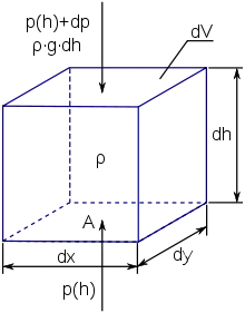 نتخيل حجما dV من الهواء في شكل مكعب ذو ضلع طوله يحتوي على هواء كثافته ونتخيل تغير بسيط في الارتفاع مقداره . تعمل على السطح من أسفل قوة الضغط الجوي p وتبلغ بالنسبة للمساحة المختارة . وأما القوة المؤثرة على المساحة الأرضية للمكعب من أعلى فهي تتكون من القوة الناشئة عن وزن كمية الهواء في المكعب dm بالإضافة إلى ضغط الجو الماثل على المساحة من أعلى p+dp). A).