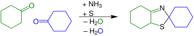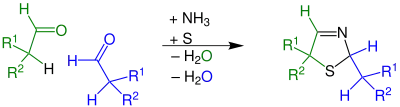 يمكن إجراء التفاعل أيضاً باستخدام عنصر الكبريت؛ كما يمكن أن يستحصل على الناتج من تفاعل مركبات ثيوألدهيد أو ثيوكيتون مع الأمونيا.[3]