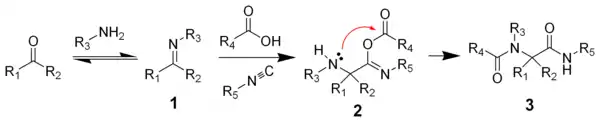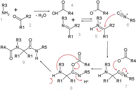 أمين 1 و كيتون 2 يشكلان الإمين 3 مع فقدان معادل واحد من الماء. تبادل البروتون مع الحمض الكربوكسيلي 4 ينشط الأيون الإميني 5 إلى نوع محب للنواة من الإيزوسيانيد 6 مع ذرة الكربون الأخيرة إلى أيون نيتريليوم 7. إضافة أخرى محبة للنواة تحدث في هذا المتوسط مع أنيون الحمض الكربوكسيلي إلى 8. الخطوة النهائية هي إعادة الترتيب مع نقل مجموع الأسيل R4 من الأكسجين إلى النيتروجين. علما أنه في تفاعل باسيريني المماثل (يفتقر إلى الأمين) يتفاعل الإيزوسيانيد مباشرة مع مجموعة الكربونيل ولكن الجوانب الأخرى من التفاعل هي نفسها. كل خطوات التفاعل منعكسة باستثناء إعادة الترتيب، الذي يقود تسلسل كل التفاعل.