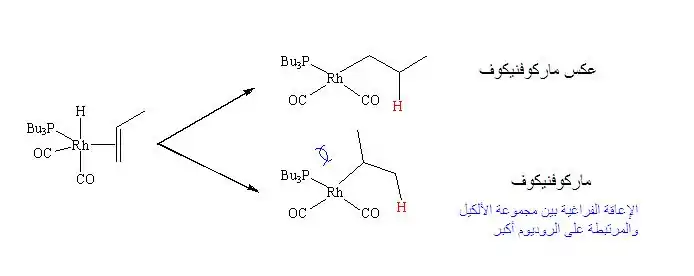 تؤدي إضافة الهيدروجين إلى الكربون المتصل عدد درات هيدروجين أكثر (قاعدة ماركوفنيكوف) إلى تشكل مجموعة ألكيل أكثر إعاقة فراغية قريبة من الربيطة الموجودة على معدن الروديومز فإذا كانت الربيطة كبيرة نسبيا مثل ثلاثي بوتيل فوسفين فإن التأثير الفراغي (الإعاقة الفراغية) سيكون أكبر مما يقلل من احتمالية الإضافة حسب قاعدة ماركوفنيكوف وبالتالي تزيد الانتقائية باتجاه المنتج الخطي (نظامي).