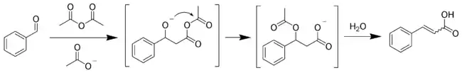 فمثلا يتفاعل مزيج البنزالدهيد وبلاماء حمض الخليك بوجود خلات الصوديوم ليعطي حمض السيناميك بالتسخين عند درجة حرارة (180-170) درجة مئوية لمدة خمس ساعات. كما يعد تفاعل فينيل حمض الخليك مع البنزالدهيد وثلاثي إيثيل الأمين وبلاماء حمض الخليك ليعطي ألفا فينيل حمض السيناميك أحد الأمثلة على هذا النمط من التفاعلات.
