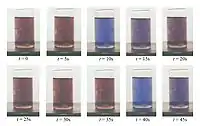 - مع مواصلة الخلط يضاف 1 مل من المحلول (د)، يشاهد حينها أن لون وسط التفاعل يتغير بطريقة دورية من الأزرق إلى الأحمر.[12]