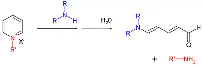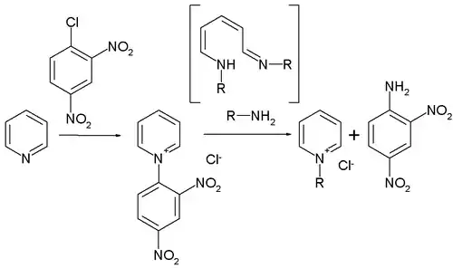 عند تسخين الأمين الأولي مع ملح ن-2،4-داي نيترو فينايل-بيريدينيوم (2)، إضافة الأمين يؤدي إلى فتح حلقة البيريديوم. الإضافة الثانية للأمين يؤدي إلى نقل 2,4-داي نيترو أنيلين (5) وتشكيل ملح الملك [4] الملك يمكن أن يتفاعل عن طريق إعادة ترتريب جزيئات الأيون المزدوج المتوسطة لإعطاء حلقة متوسطة (7).[5] هذا تم اعتباره معدل التفاعل.[6][7] بعد نقل البروتون وتفاعل حذف الأمين، يتم تكوين أيون البيريديوم (9) المطلوب.