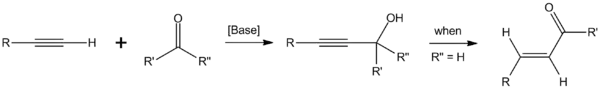 يتكون معدن الأستيليد في الموقع عندما يتم معاملة ألكاين بقواعد قوية مثل الهيدروكسيد أو ألكوكسيد.[4] وبعد ذلك يتفاعل معدن الأستيليد مع ألدهيد أو كيتون لتكوين كحول البروبرجايل. وفي حالة وجود الألفا هيدروجين (كما هو الحال عندما يكون الكربونيل ألدهيد)، فإنه سوف يحدث له نزوح بروتوني إلى الإينون المقابل.