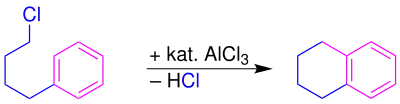 يمكن أن يتم تفاعل فريدل-كرافتس داخل الجزيء نفسه، كما هو الحال في تفاعل تحضير التترالين: