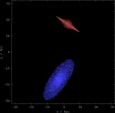 من الوسائل المستخدمة في التحليل النظري لتطور المجرات طرق المحاكاة بالحسابات الحاسوبية على أساس أن القوة المسيطرة هي قوة الجاذبية بين المجرات. وتبين تلك الحسابات أن الأغلبية من المجرات التي نشاهدها ينشأ من توحد مجرتين حلزونيتين غنيتين بالغاز، وينتج عنها مجرة إهليلجية (بيضوية). لا تتحرك النجوم في المجرة الإهليلجية بيضوية في مستوي واحد، وإنما تتحرك في أفلاك في شكل القطع الناقص وفي مستويات مختلفة. ويمكن تفسير الشكل البيضوي للمجرة الإهليلجية بالتقاء مجرتين قرصيتين مستويتين بزاوية (انظر الصورة)، فينتج من هذا الالتقاء مجرة أكبر لا يسودها مستوي معين واضح.