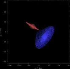 - مرحلة الاقتراب : يبين الشكل على اليمين مرحلة اقتراب مجرتتين قرصيتين. وباعتبار سرعة الاقتراب أقل من 100 كيلومتر في الثانية. ولكن توجد تقاربات قد تصل السرعة النسبية لحوصلتي المجرتين إلى 3000 كيلومتر/ثانية. وعند الاقتراب تتغير أشكال البنية الداخلية لكل من المجرتين وقد تنشأ بينهما في تلك المرحلة استبدال لجزء من الغاز والنجوم عبر ما يشبه القنطرة.
