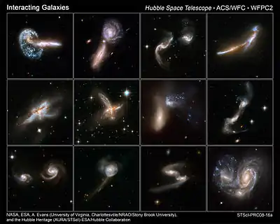 - التبادل التجاذبي : تبين الصورة اليسرى تغير شكلي المجرتين في الداخل وفي الخارج، وقد يحدث انزياح لمناطق غنية بالمادة في كل منهما. ثم تبعد المجرتان عن بعضهما في سيولة، وقد تعمل الجاذبية الذاتية لكل منهما على نشأة أذرعة مجرية أو ضلع مجري. وهنا تأثر البنية الداخلية عل الشكل الناتج لكل منهما. وعند ابتعاد المجرتان عن بعضهما تحدث فترة تهدئة، ينتج عنها إما أن تلتقي المجرتان مرة تالية وينتج عنه التحامهما أو تفترق المجرتان عن بعضهما البعض بعد هذا اللقاء الأول.