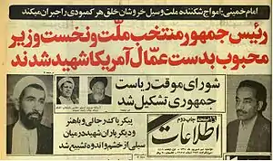 |CitationClass=تم تجاهله (مساعدة); no-break space character في|عنوان=على وضع 26 (مساعدة) - "استشهد رجائي وباهنر". Iranian History. مؤرشف من الأصل في 24 أكتوبر 2018. اطلع عليه بتاريخ 21 مارس 2017. الوسيط