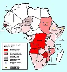 - وفي عام 2000، أبلغت منظمة الصحة العالمية رسميًا بحدوث حوالي 000 140 حالة من حالات الكوليرا. وشكلت بلدان أفريقيا 87٪ من تلك الحالات.[42]