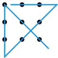 أحجية "النقاط التسع". الهدف من اللغز هو الربط بين النقاط باستخدام أربعة خطوط مستقيمة دون رفع القلم أو الرجوع على الخط قبل الانتهاء من الحل.