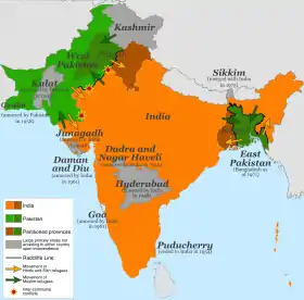 كان تقسيم الهند عام 1947 تقسيم الهند البريطانية [lower-alpha 3] إلى دولتين مستقلتين سيادة الدول، الهند وباكستان . [6] دومينيون الهند هي اليوم جمهورية الهند . دومينيون باكستان هي اليوم جمهورية باكستان الإسلامية وجمهورية بنغلاديش الشعبية . و التقسيم تشارك تقسيم مقاطعتين، البنغال والبنجاب ، على أساس غير مسلم أو حي الحكيمة المسلمين الأغلبية. وشهد التقسيم أيضًا انقسام الجيش الهندي البريطاني ، والبحرية الملكية الهندية ، والخدمة المدنية الهندية ، والسكك الحديدية ، والخزانة المركزية. تم تحديد التقسيم في قانون الاستقلال الهندي لعام 1947 وأسفر عن حل الراج البريطاني ، أو حكم التاج في الهند. ظهرت دولتا الهند وباكستان المتمتعة بالحكم الذاتي بشكل قانوني في منتصف ليل 15 أغسطس 1947.
