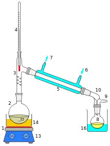 الوصف: (1)السوائل المراد تقطيرها، تُسخن القارورة قليلا. (2) نظام أنبوبي قصير، ويحتوي على أنبوب داخلي معوج بحيث ينزلق السائل المتكثف إلى قارورة السائل المقطّر. (3) مدخل ماء التبريد. (4) مخرج ماء التبريد. (5) توصيلة الهواء المخلخل.(6) قارورة السائل المقطّر، وتحفظ باردة.