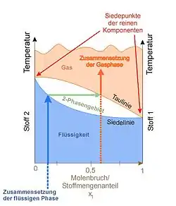 وكما بالشكل المجاور : عندما نقوم بتسخين مخلوط السوائل 1 (ودرجة غليانه منخفضة) والسائل 2 (درجة غليانه مرتفعة)، وليكن نسبة المخلوط الابتدائية نحو 0.1 (أي 10 % (السهم الأزرق الرأسي)). فترتفع درجة حرارة المخلوط إلى أن تصل منحنى الغليان (منحنى السائل باللون الأزرق). ويتكون البخار الناتج فوق السائل المغلي غنيا ببخار السائل ذو درجة غليان منخفضة، وفقيرا بالنسبة لبخار السائل ذو درجة غليان مرتفعة (تابع السهم الأفقي من اليسار إلى اليمين عند درجة حرارة ثابتة، حيث يلتقي بمنحنى البخار (الخط الأحمر)). ويلتقي السهم بمنحنى البخار عند نسبة 0.6 (أي أن نسبة السائل المراد تنقيته في البخار أصبحت 60 %). وعند تكثيف البخار نحصل على سائل يساوي في نسبته نسبة السائلين في البخار. بذلك يصبح السائل الناتج غنيا بالسائل ذو درجة غليان منخفضة. ويلاحظ أنه مع مرور الوقت تقل نسبة السائل (الطيّار) إلى السائل ذو درجة غليان عالية في قارورة الغليان.