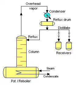 تملأ الغلاية بمخلوط السوائل ويسخن . فتتصاعد الابخرة في عامود التقطير وتتكثف عند القمة . وتعاد عادة كمية السائل المتكثفة في البداية إلى عامود التقطير، حيث يعمل تقابل البخار والسائل على تحسين عملية الفصل. وبعد نهاية مرحلة البدء هذه، نبدأ بسحب جزء من السائل المكثف النقي، وتصل إلى الوعاء . وتستمر عملية التقطير بإعادة سريان الجزء الآخر إلى العامود .