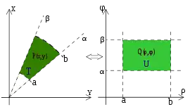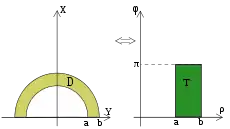 - المجال هو وهو القوس الدائري الواقع في الجزء الموجب من محور y (أنظر الشكل)، لاحظ ان φ تصف زاوية مستوى، بينما ρ تتراوح بين 2 و3. لذلك التحويل الناتج يكون المستطيل التالي: