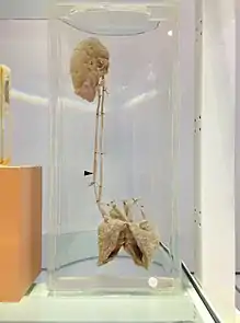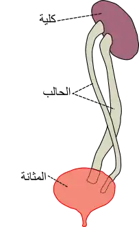 ![]() رسم توضيحي يبين وجود حالبين بدلا من حالب واحد، هذه الحالة النادرة عيب خِلْقِيّ وتُسمى: "تكرار الحالب". رسم توضيحي يبين وجود حالبين بدلا من حالب واحد، هذه الحالة النادرة عيب خِلْقِيّ وتُسمى: "تكرار الحالب". | |