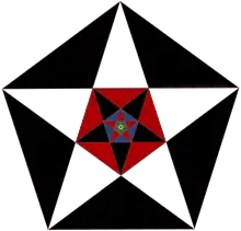 و يمثل الشكل التالى العلاقة بين التكرار و الاستدعاء الذاتى؛ حيث أنه بتوصيل نقاط تقاطع أضلاع الشكل الخماسى المنتظم بالتناوب تنتج نجمة خماسية تحوي بداخلها خماسي أضلاع أصغر مقلوب. تكرار هذه العملية ينتج متتاليات منبثقة من خماسي الأضلاع والنجمة الخماسية وهي أيضاً توضح عملية الاستدعاء الذاتى.
