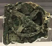 | الحاسوب التناظري | 150 قبل الميلاد | في عام 1900-1901 عُثر على ميكانيزم أنتيكيثيرا في حطام سفينة أنتيكيثيرا. أُعتقد أن هذا الجهاز كان حاسوب تناظري، صُمم واستُخدم لحساب المواضع الفلكية واستُخدم للتنبأ بالكسوف الشمسي و الخسوف القمري بناءاً على دورات المتواليات الحسابية البابلية. وبينما يعتبر ميكانيزم أنتيكيثيرا حاسوب تناظري، فإن الأسطرلاب (اختُرع أيضا بواسطة الإغريق) يعتبر أكثر تطوراً.[11] | ![]() |