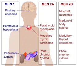 | الجينات | MEN1 (قالب:OMIM4) | RET (قالب:OMIM4) | RET (قالب:OMIM4) | RET (قالب:OMIM4), NTRK1 (قالب:OMIM4) |