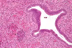 ![]() صورةٌ مجهرية تُظهر خلايا دم حمراء ذات أنوية (أسفل يسار الصورة)، وهي مكونٍ ضروري لتكون الدم خارج النخاع في سليلة بطانة الرحم. الصُورة بصبغة الهيماتوكسيلين واليوزين. صورةٌ مجهرية تُظهر خلايا دم حمراء ذات أنوية (أسفل يسار الصورة)، وهي مكونٍ ضروري لتكون الدم خارج النخاع في سليلة بطانة الرحم. الصُورة بصبغة الهيماتوكسيلين واليوزين. | |